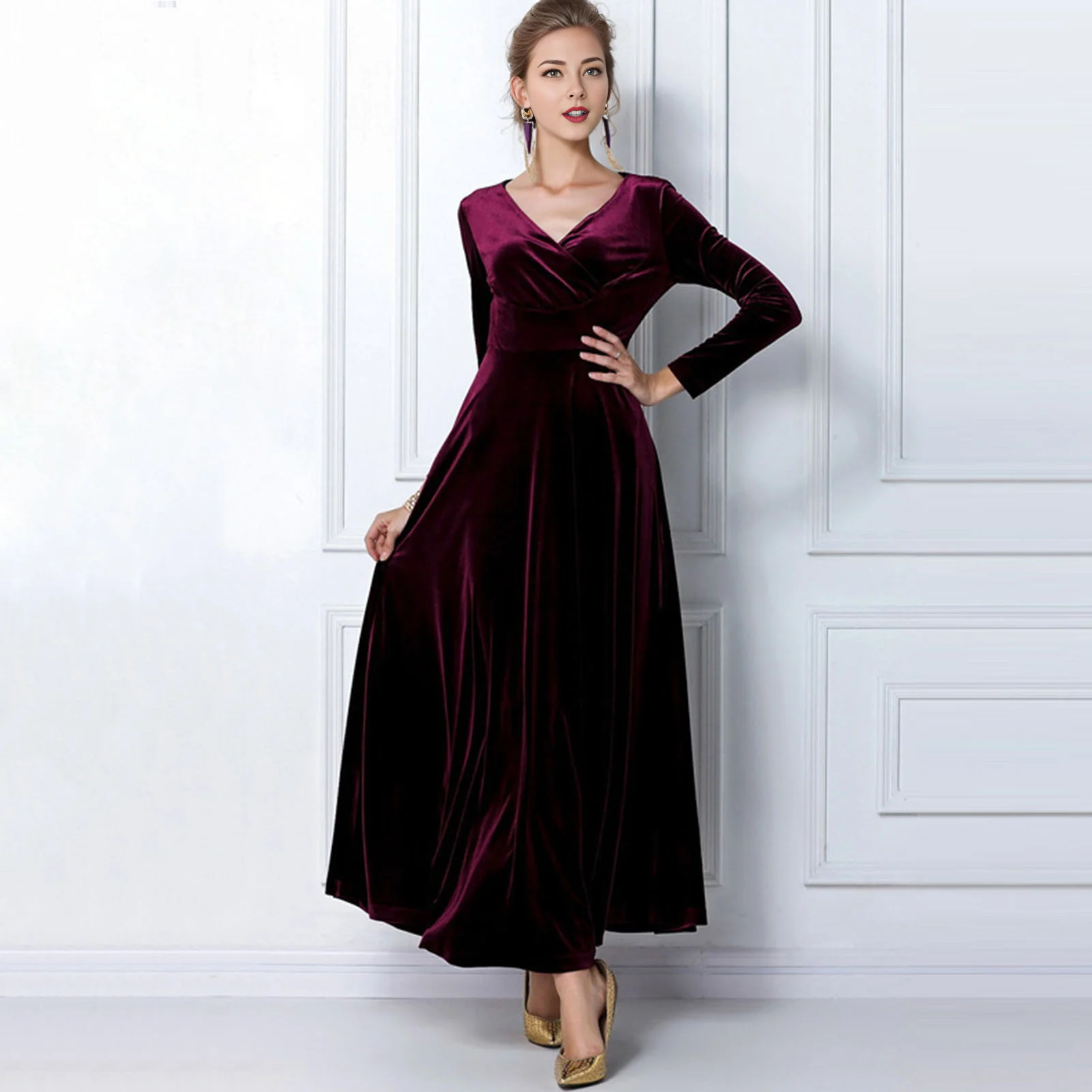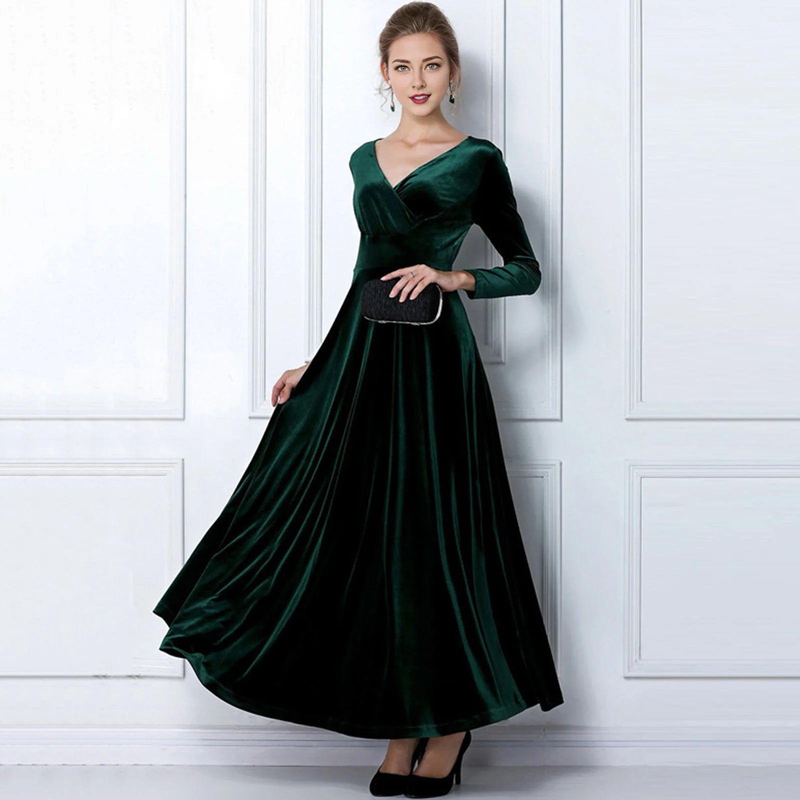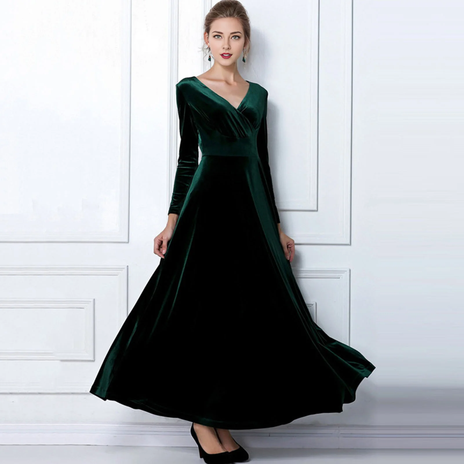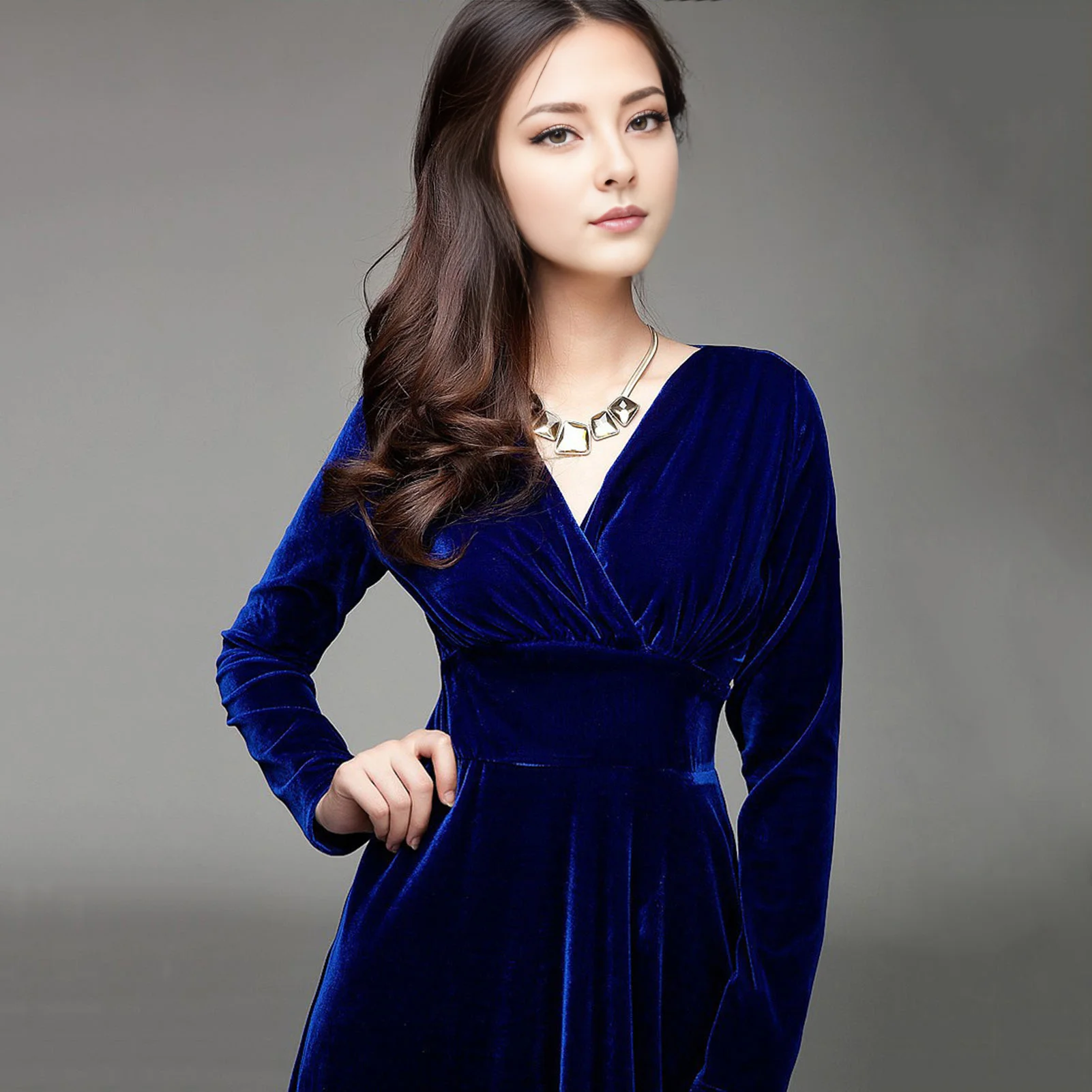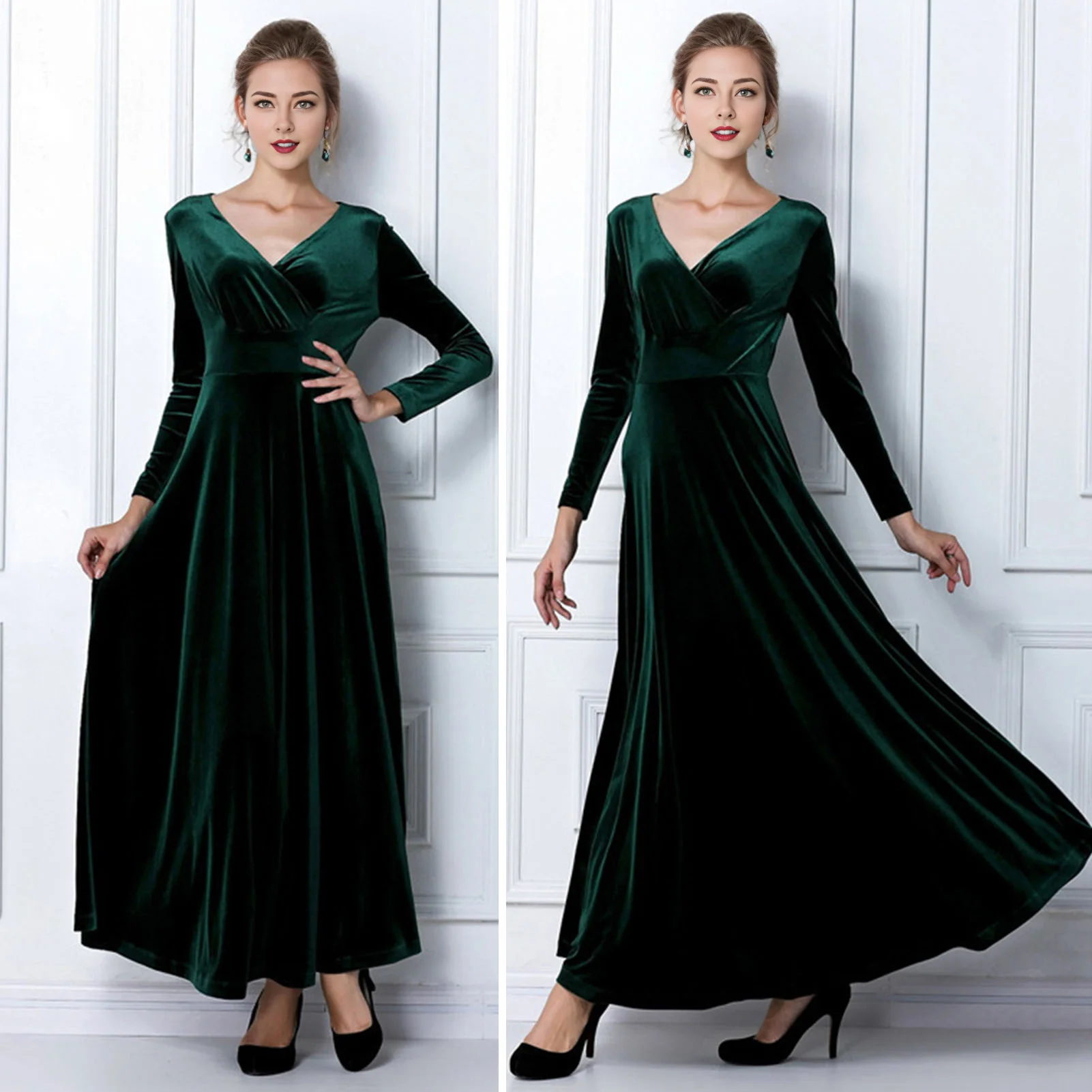 Women's Dress: Elevate your style with this stunning women's dress that exudes elegance and charm. Crafted from luxurious gold velvet, this V-neck long-sleeved dress boasts a fitted silhouette and an A-line hem, ensuring a flattering and fashionable look.